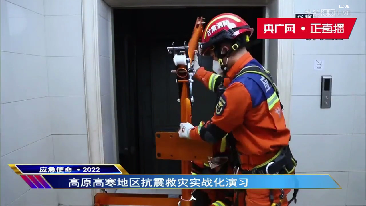 演習(xí)模擬甘肅省張掖市甘州區(qū)發(fā)生7.5級地震,大量房屋倒塌人員埋壓被困于商場電梯井中。平?jīng)鱿谰仍ш犂锰m州德利泰電子電氣有限公司的多功能救援支架構(gòu)設(shè)繩索救生系統(tǒng),起吊生的希望。